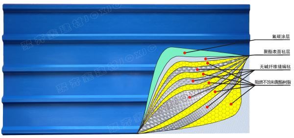 特點:聚酯防腐瓦產品簡介  聚酯防腐瓦是以不飽和聚酯樹脂加阻燃劑為主要原料,又以無堿玻璃纖維短切縫編氈為主要增強材料,加耐候聚酯氈和高耐候氟碳涂層,通過使用目前國內先進的復合材料拉擠技術,以8000kg的拉力,在高壓、高溫條件下生產而成的高致密度、高強度的產品。  合理的產品配方、配料與設計,從根本上解決了一般普通復合材料包括金屬瓦腐蝕生銹、不耐老化、漆層脫落、風雨環境下噪音大的問題;解決了如塑鋼(pvc)合成樹脂瓦防火等級差、隨環境熱脹冷縮、高溫變形、幾何尺寸不穩定、褪色、不抗沖擊(如冰雹襲擊易碎)、檁距要求過小、污染環境等問題;解決了如FRP玻纖瓦厚薄不均、粗糙無棱角、產品不致密、工藝膜易老化起皮脫落、耐候等級低、易燃、易粉化開裂、不耐氫氟酸等問題。  聚酯防腐瓦的性能特點:  幾何尺寸穩定,超好的耐高、低溫性能  聚酯防腐瓦在常規平均生產溫度192℃條件下固化定型。經測試,聚酯防腐瓦熱變形溫度高于250℃,它的熱膨脹系數為1.92×10-5/℃-1  經30次凍融循環試驗,無裂紋、空鼓、起泡、剝離現象。因此,在使用中不會隨溫度變化而出現下垂、隆起、變形等狀況。  超強的耐候性能  產品有氟碳涂層和聚酯氈的雙重耐候保護,確保了聚酯防腐瓦的使用壽命。即使長期暴露于紫外線、熱、寒、濕氣、腐蝕環境下,仍能保持產品的穩定性,確保產品長期安全使用。(國家化學建筑材料測試中心10000小時耐候檢測△E值≤5,在國家標準技術要求范圍內;注:實驗室10000小時,相當于自然環境中28年)。  優越的耐腐蝕性能  聚酯防腐瓦所使用的原材料本身就具有耐腐蝕性。聚酯防腐瓦經在15%鹽酸、20%硫酸、40%氫氟酸、15%硅氟酸、20%磷酸、20%硝酸、5%氫氧化鈉、氨水溶液中浸泡120小時測試,產品無明顯變化。  較強的抗風性能  聚酯防腐瓦本身堅韌致密,專用配件設計合理,可以承受2000pa風壓。(相當于8-10級風力)  堅固的抗冰雹襲擊性能  聚酯防腐瓦以無堿玻璃纖維縫編氈為增強材料,在遇到50mm以內的冰雹時不會出現被擊穿破損現象。檢測用1kg的鋼球,在距離聚酯防腐瓦表面3m高的位置自由落下不會產生破裂現象。  優越的抗荷載性能  聚酯防腐瓦采用先進的拉擠技術,具有更高的機械強度和物理性能。